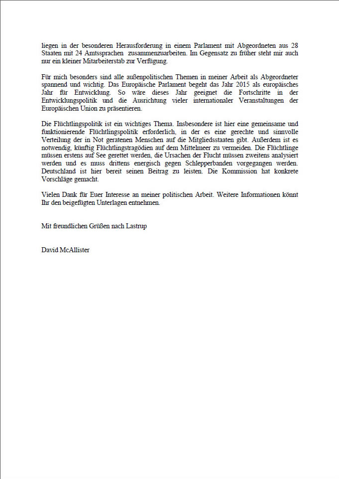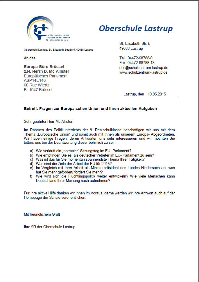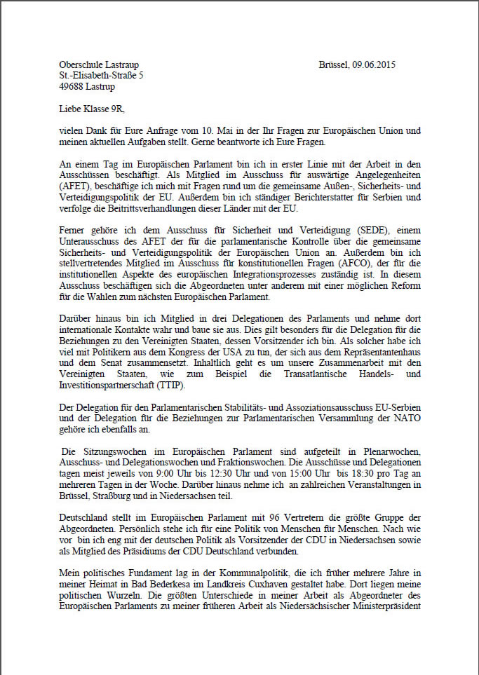 Die Idee zum Brief an David McAllister entstand im Rahmen des Politikunterrichts in der 9R, in dem wir uns mit dem Thema "Europäische Union" , der Arbeit des Europäischen Parlaments und der Flüchtlingskatastrophen befasst haben. Hierbei entstand die Idee, einen Abgeordneten direkt zu befragen. Groß war dann natürlich die Freude über eine zügige und ausführliche Antwort! |